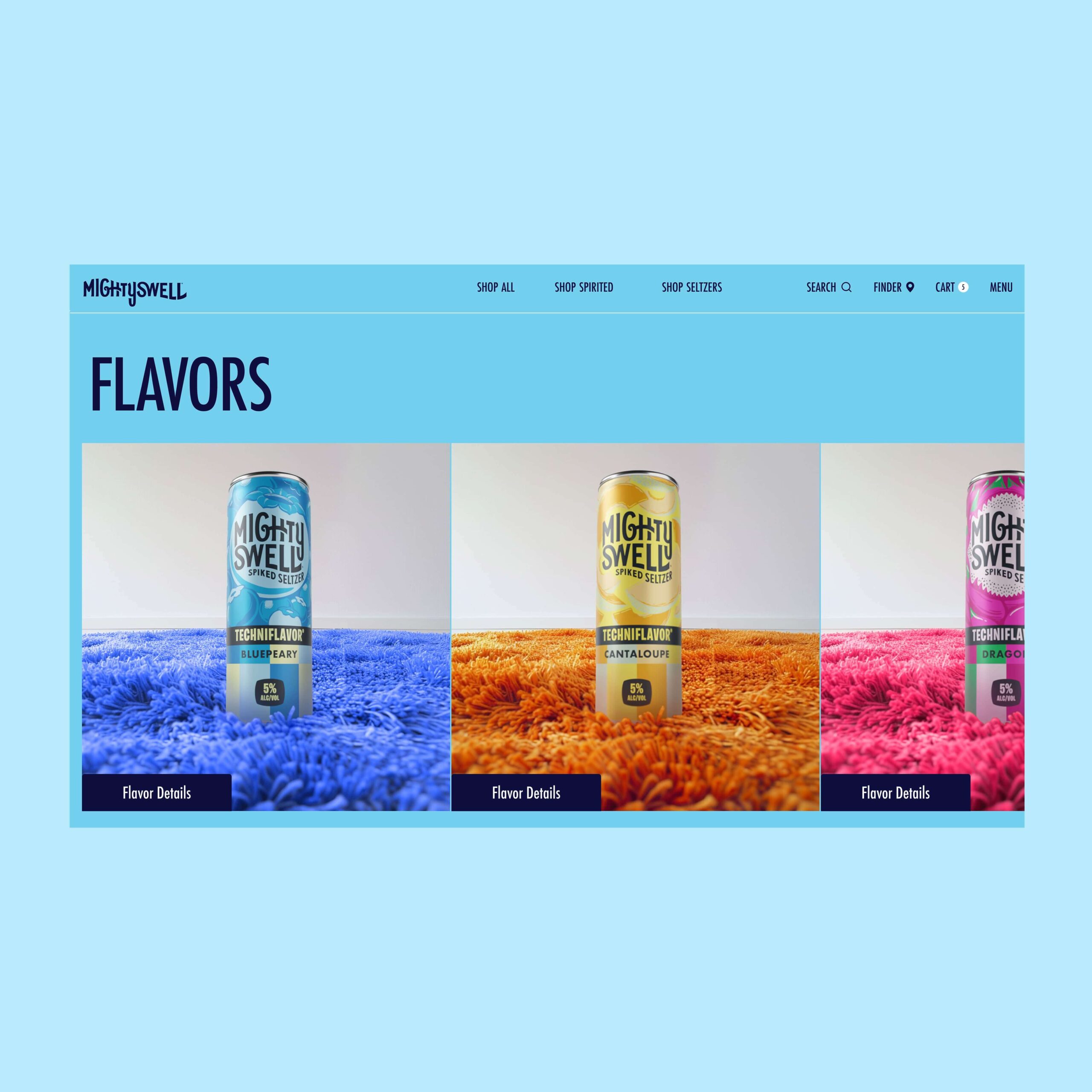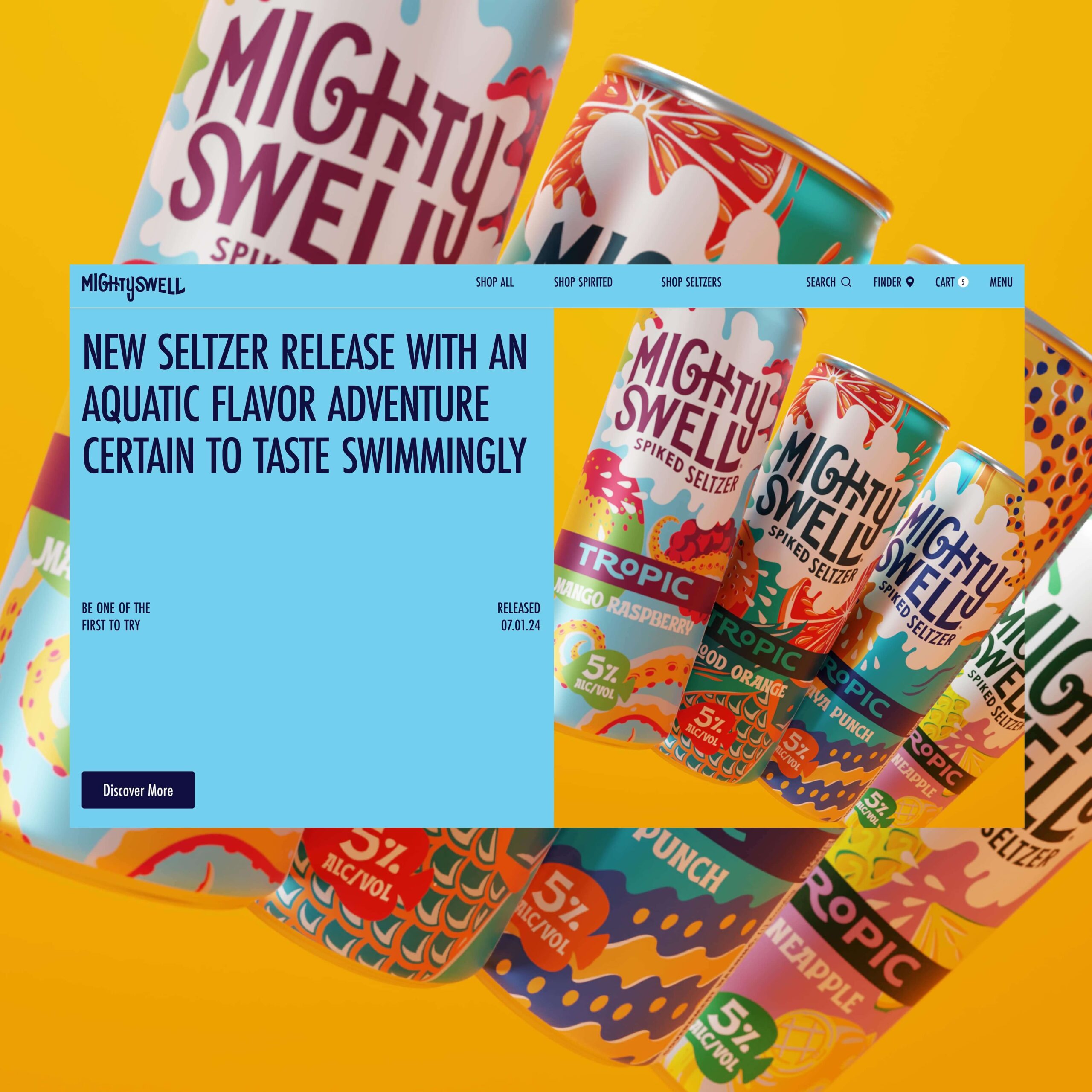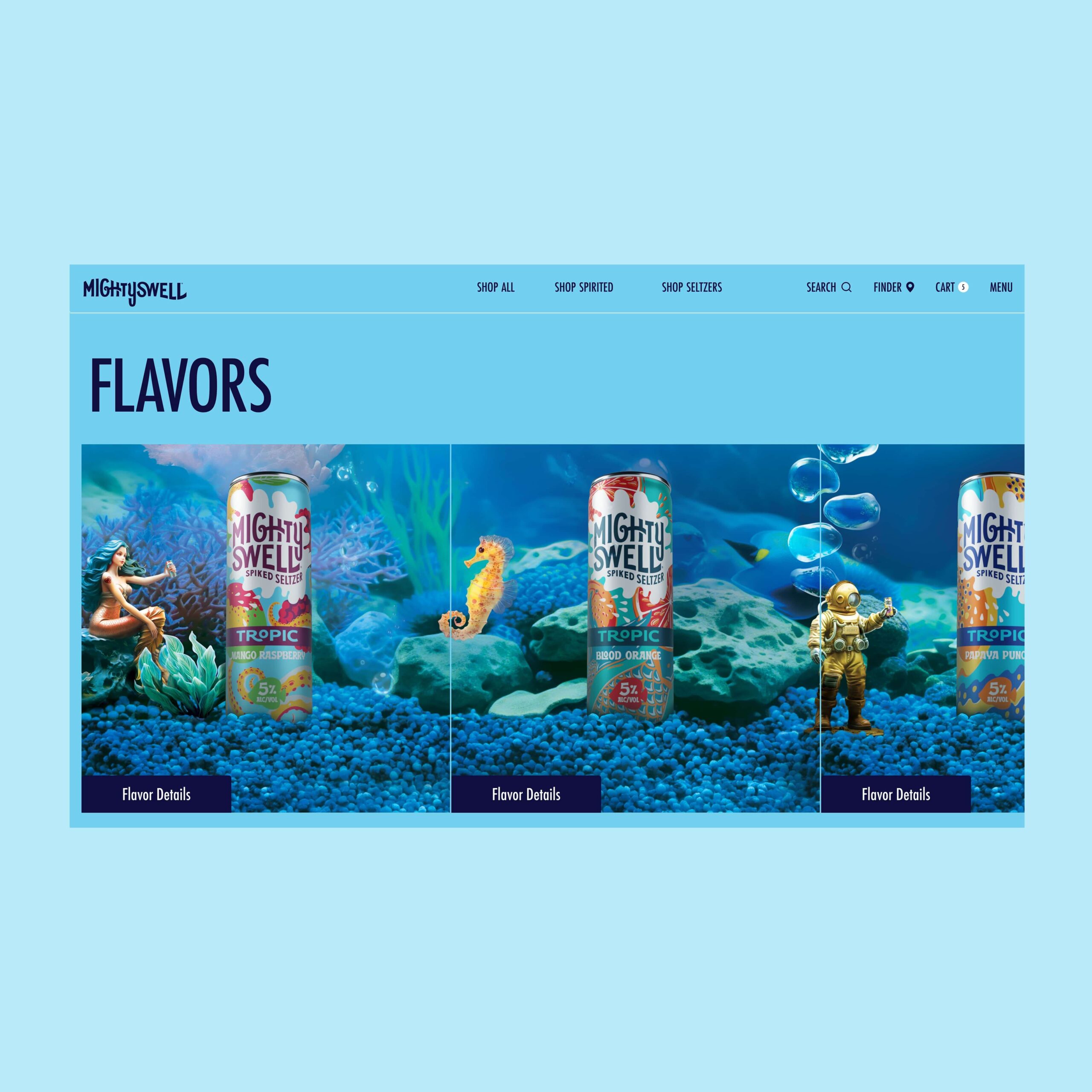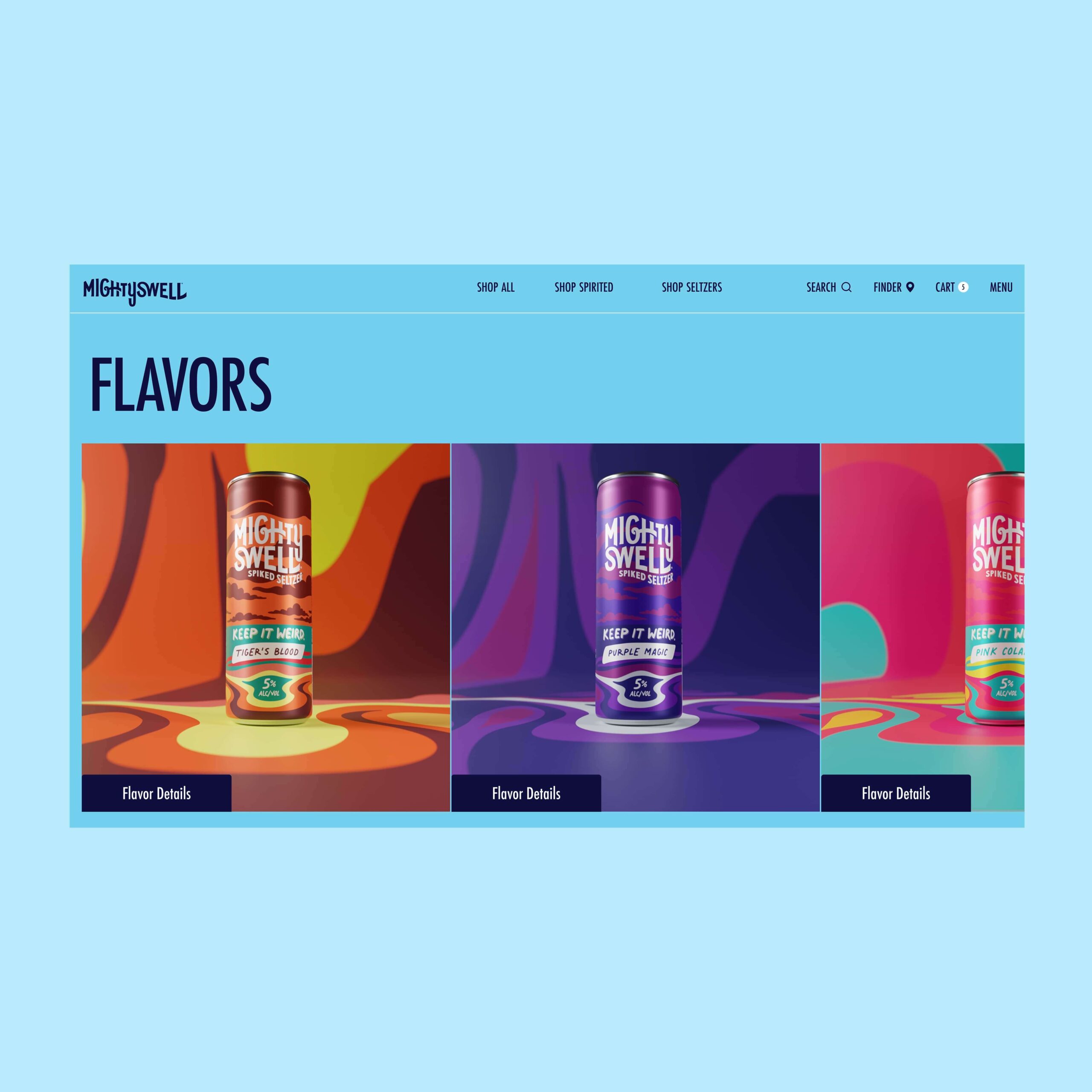 The world of Mighty Swell embodies sub-beverage identities of Techniflavor®, Ready To Disco®, Tropic®, Cherryosity®, Mastery®, Keep It Weird®, and Orginal®. Immersing ourselves in the business and consumer objectives provided a refreshing outlook for the future of the respective beverage ecosytem. Mighty Swell's new launch and go-to-market strategy leverages a custom beverage finder, omni-purchase opportunities. Each path through the website, audiences are able to live in each of the unique brand worlds of their favorite case packs.